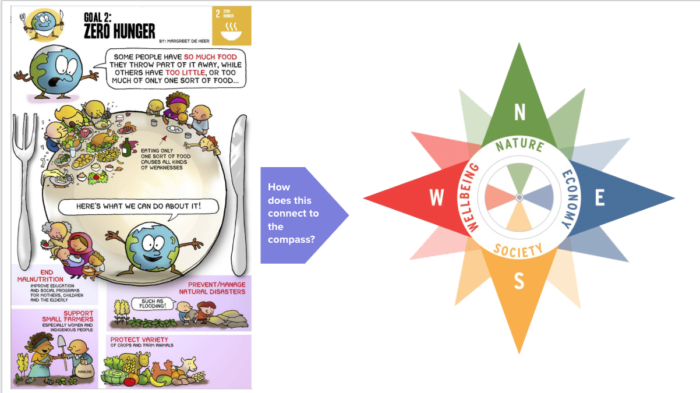 In 7th grade social sciences thematics our students tackle SDG #2 – End Hunger: Achieve Food Security & Improved Nutrition, and Promote Sustainable Agriculture. An integral part of all thematics units is the integration of the “Why It Matters” informational reading activity and utilizing the Sustainability Compass. Both of these initial activities work to build understanding of the focus goal and teach students how to Think in Systems. The Compass Model of systems thinking creates an opportunity for students to connect the dots between nature, society, wellbeing, and the economy. It allows students to understand cause and effect relationships and begin to understand that the solutions to these issues, are as interconnected as the problems
